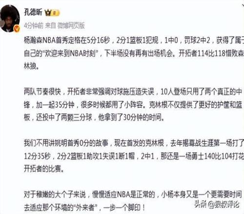 媒体人“孔德昕”发文点评:杨瀚森NBA首秀定格在5分16秒,2分1篮板1犯规,1中0,罚球2中2,获得了属于自己的“欢迎来到NBA时刻”,下半场没有再有出场机会。开拓者114比118惜败森林狼。