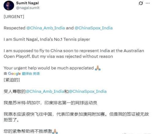 印度网球选手前往中国参赛遭拒签,社媒求助中国驻印度大使馆